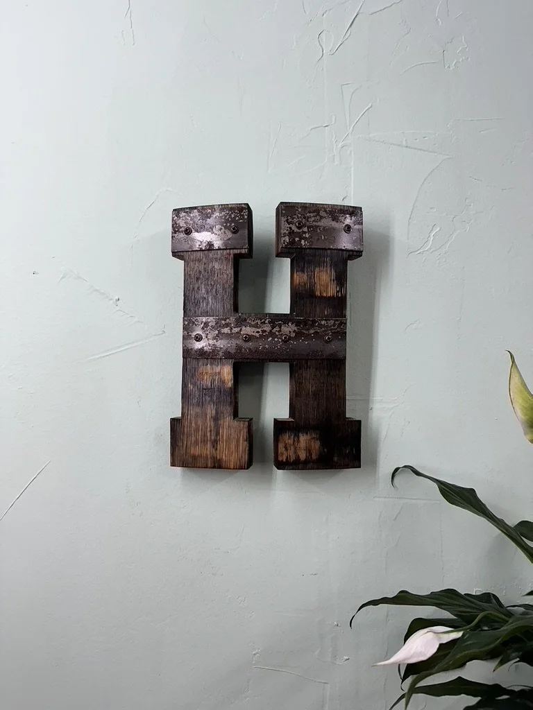 This cutout is made from real bourbon barrel staves. It is assembled by aged bourbon barrel rings. Each letter will be unique depending on the barrels and rings. Each one representing a different past. Each letter is assembled using specialized screws with a customized patina. The edges of the letter are bourbon charred. The letter is 11 inches tall, 8 inches wide and 1 inch thick. I have clear coated the back to seal the char.